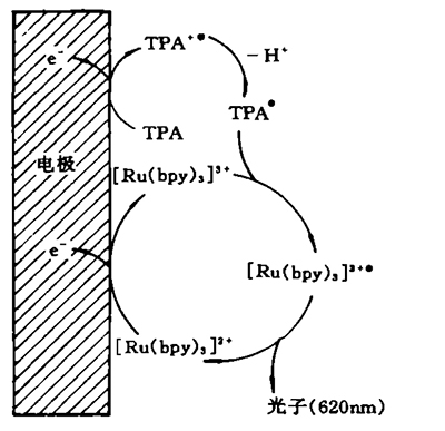 [Ru(byp)3] 2+,三丙胺(TPA)用來激發(fā)光反應(yīng)。在陽極表面,兩種物質(zhì)同時(shí)失去電子。在電極板上[Ru(byp)3] 2+被氧化成[Ru(byp)3] 3+,TPA也被氧化成陽離子自由基(TPA+. ),(TPA+. )自發(fā)地釋放一個(gè)質(zhì)子而變成非穩(wěn)定分子(TPA.),將一個(gè)電子遞給[Ru(byp)3] 3+,形成激發(fā)態(tài)的[Ru(byp)3] 2+.。[Ru(byp)3] 2+.在衰減的同時(shí)發(fā)射一個(gè)波長為620nm的光子,重新回到基態(tài)[Ru(byp)3] 2+。這一過程在電極表面反復(fù)進(jìn)行,產(chǎn)生高效、穩(wěn)定的連續(xù)發(fā)光,并不斷增強(qiáng)。
