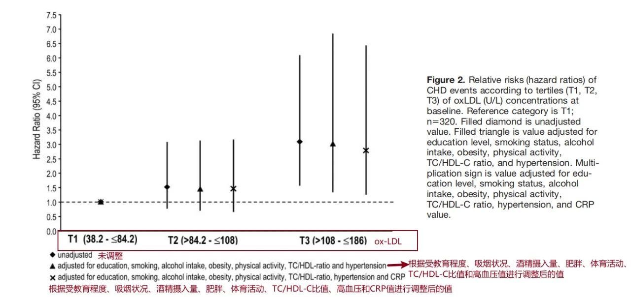 研究對(duì)象為進(jìn)行2項(xiàng)基于人群的MONICA/KORA調(diào)查,并進(jìn)行了隨訪(平均SD隨訪時(shí)間,5.6±2.6年)。通過(guò)ELISA檢測(cè)88名冠心病患者和258名與調(diào)查匹配的對(duì)照組的ox-LDL以及風(fēng)險(xiǎn)比(HR)。