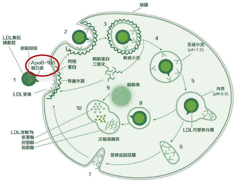 在正常情況下,天然LDL由LDL受體識(shí)別。LDL和LDL受體結(jié)合后,內(nèi)吞入細(xì)胞,與溶酶體結(jié)合。在溶酶體酶的作用下,蛋白質(zhì)降解為氨基酸,膽固醇酯水解為游離膽固醇和脂肪酸。此受體受到細(xì)胞內(nèi)膽固醇含量的下降調(diào)節(jié),當(dāng)細(xì)胞內(nèi)膽固醇的含量增多時(shí),LDL受體的量便會(huì)減少。所以,天然LDL經(jīng)這一途徑代謝,不會(huì)引起膽固醇酯在細(xì)胞內(nèi)堆積。
