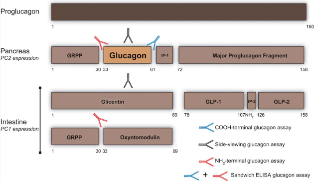 檢測試劑開發(fā)時,N端抗體會與胃泌酸調(diào)節(jié)素(oxyntomodulin)發(fā)生交叉反應(yīng),而 C 端抗體則會與胰高血糖素原1-61發(fā)生交叉反應(yīng),針對胰高血糖素中間片段開發(fā)的抗體則有可能與上述所有肽結(jié)合【11】。胰高血糖素的測定需要針對兩個末端的雙抗體夾心技術(shù),抗體特異性要求高。
