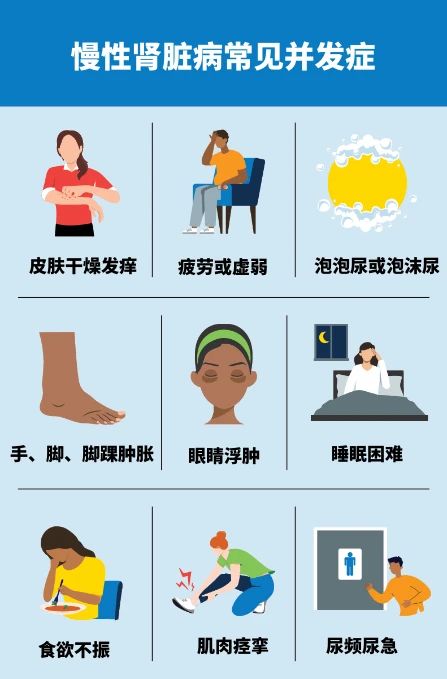 早期慢性腎臟病通常沒有癥狀,但隨著時(shí)間的推移而惡化,常見癥狀包括尿量減少、由于組織液增多引起體重增加(水腫)、疲勞乏力、食欲不振或體重?zé)o故減輕等。