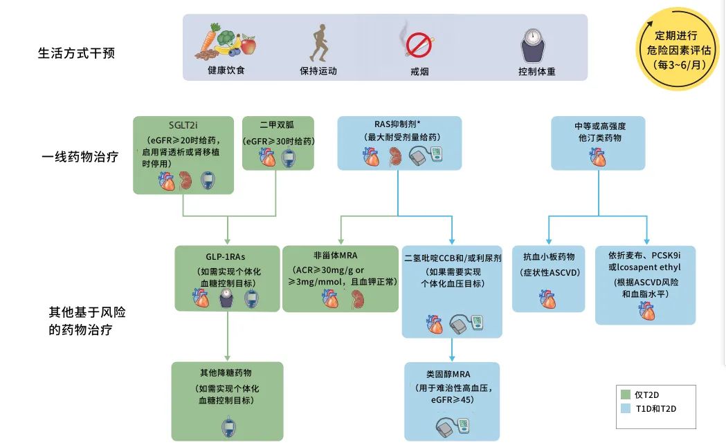 相關(guān)指南建議2型糖尿病和1型糖尿病(病程超過5年)患者應(yīng)每年至少檢查尿常規(guī)、UACR和血肌酐(計(jì)算eGFR)一次。同時(shí)重視對糖尿病腎病危險(xiǎn)因素的干預(yù),包括高血糖、高血壓、肥胖(尤其是腹型肥胖),避免腎毒性藥物及食物、急性腎損傷、蛋白攝入過多。研究表明,良好的生活方式、有效的血糖和血壓控制是防治糖尿病腎病的關(guān)鍵。