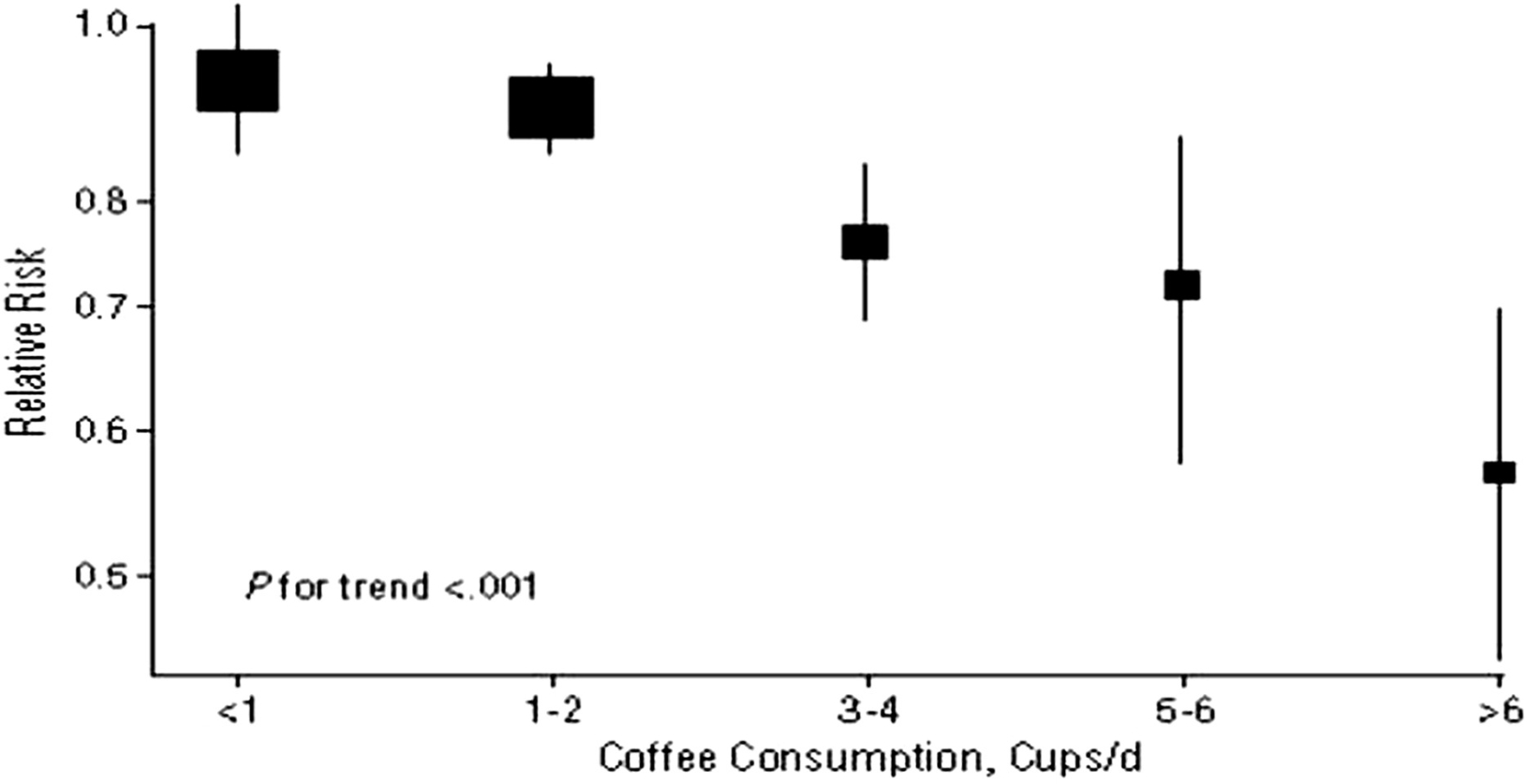 發(fā)表在ELSEVIER上的研究《Effects of Habitual Coffee Consumption on Cardiometabolic Disease, Cardiovascular Health, and All-Cause Mortality》比較了咖啡攝入量與患2型糖尿病(T2DM)風(fēng)險的相關(guān)性,指出飲用咖啡量與糖尿病的發(fā)病率呈反比,每天飲用4~6杯咖啡具有提高脂聯(lián)素水平并降低胰島素抵抗的作用。