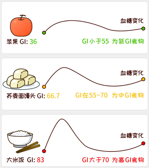低GI食物:GI≤55。低GI食物在胃腸中停留時間長,吸收率低,葡萄糖釋放緩慢,餐后血糖峰值低,有助于血糖控制;