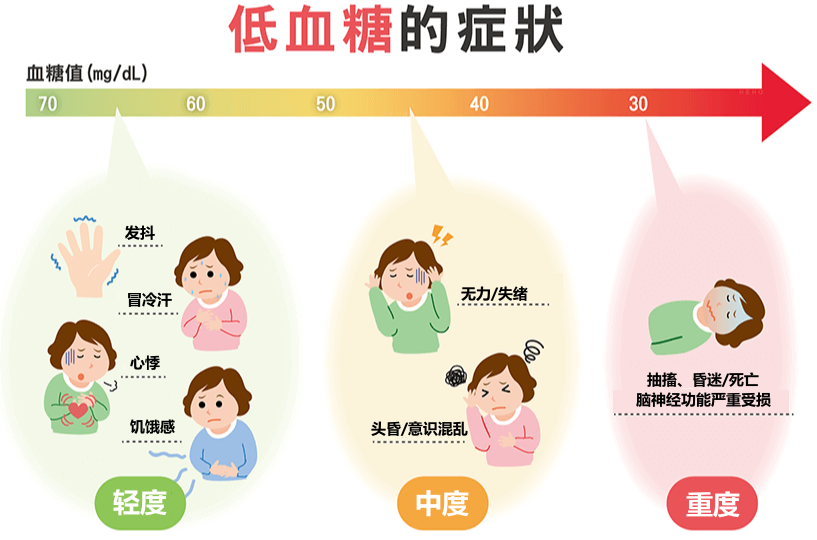 如果說(shuō)高血糖的危害是以年來(lái)計(jì)算的,那么低血糖的危害則是以小時(shí)來(lái)計(jì)算的。輕度低血糖可引起交感神經(jīng)興奮,出現(xiàn)饑餓感、頭昏眼花、心慌手顫、面色蒼白、出冷汗、虛弱無(wú)力等癥狀,而嚴(yán)重低血糖則可引起驚厥、昏迷甚至死亡。