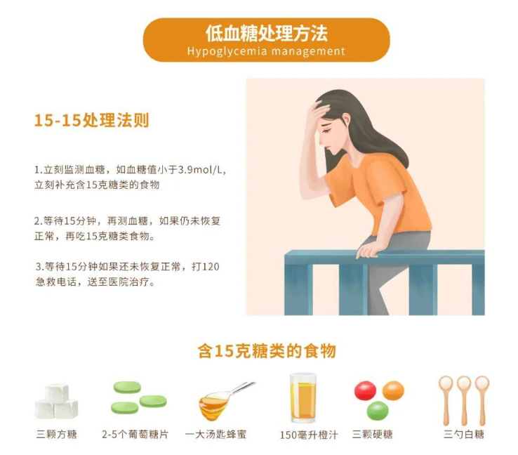 《中國(guó)糖尿病患者低血糖管理的專(zhuān)家共識(shí)》指出:患者發(fā)生低血糖現(xiàn)象,如果神志清醒,可以吞咽,推薦在可能情況下進(jìn)食碳水化合物,如不能安全進(jìn)食,須胃腸道外給糖或藥糾正低血糖。15-15處理法則便是方法之一:攝入15克快速消化的碳水化合物,等待15min再測(cè)血糖,如還未恢復(fù)正常,打120急救電話(huà),送至醫(yī)院治療。
