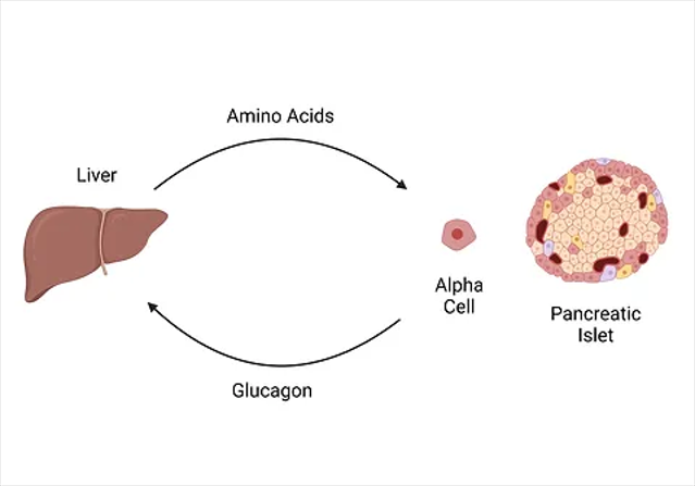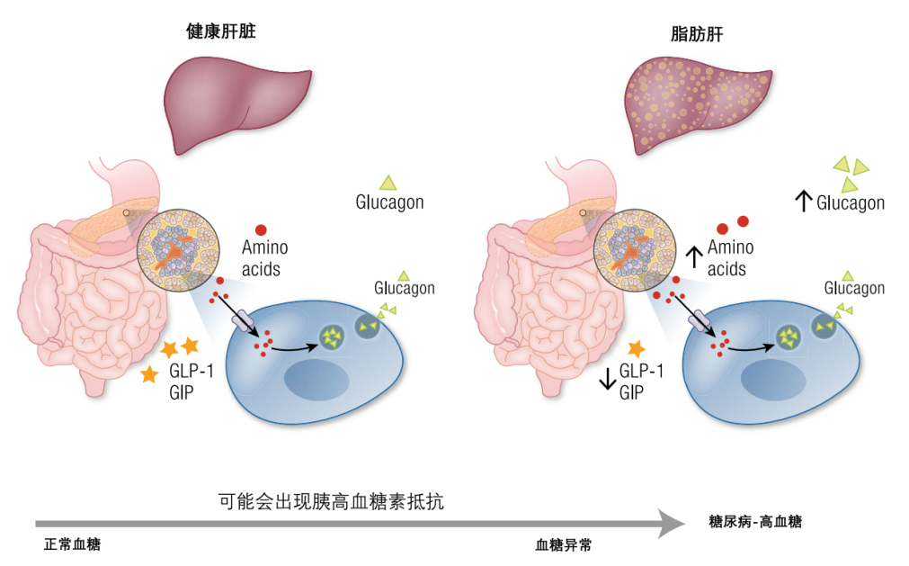 在代謝性疾病中,如2型糖尿病和/或代謝相關(guān)脂肪性肝病,肝臟脂肪變性會在肝臟脂質(zhì)和氨基酸代謝水平上升時導(dǎo)致對胰高血糖素的抵抗,胰高血糖素刺激的尿素生成減少,循環(huán)中的氨基酸水平會升高,這種高氨基酸血癥會導(dǎo)致高胰高血糖素血癥。
